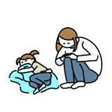 登園拒否する男の子とオフィスカジュアルのママ